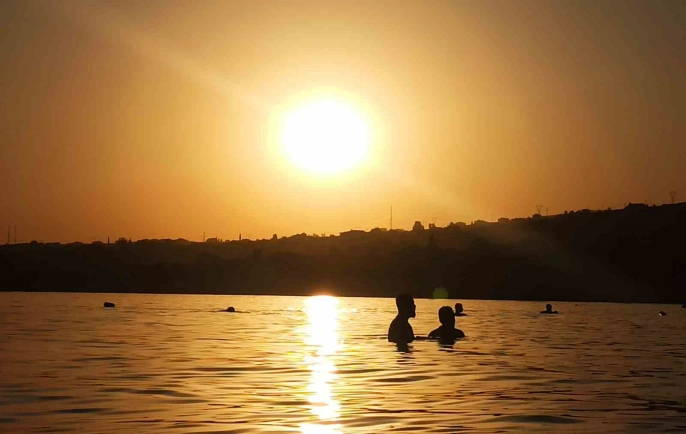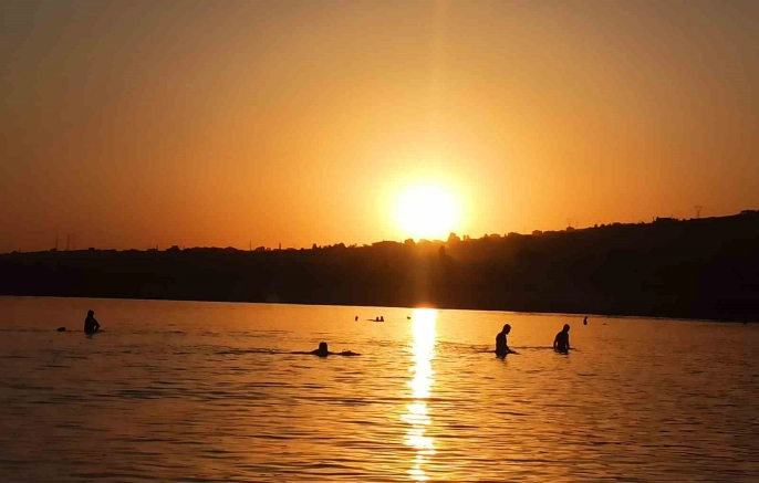 Gün batımında Van Gölü'ne giren vatandaşlar, serinliğin yanı sıra güneşin göl üzerindeki eşsiz yansımasını da izleme fırsatı buluyor. Bu doğal güzellik, yaz aylarında Ahlat'ı ziyaret edenler için unutulmaz bir deneyim sunuyor.