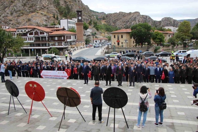 Öğrencilerin de katıldığı kortej yürüyüşüyle başlayan törende, Yavuz Selim Meydanı’ndaki Atatürk anıtına çelenkler sunuldu. Vali Önder Bakan, CHP Amasya Milletvekili Reşat Karagöz, Garnizon Komutanı Tuğgeneral Kemal Çakıroğlu ve Belediye Başkanı Turgay Sevindi de törene katıldı.