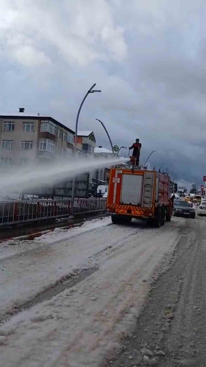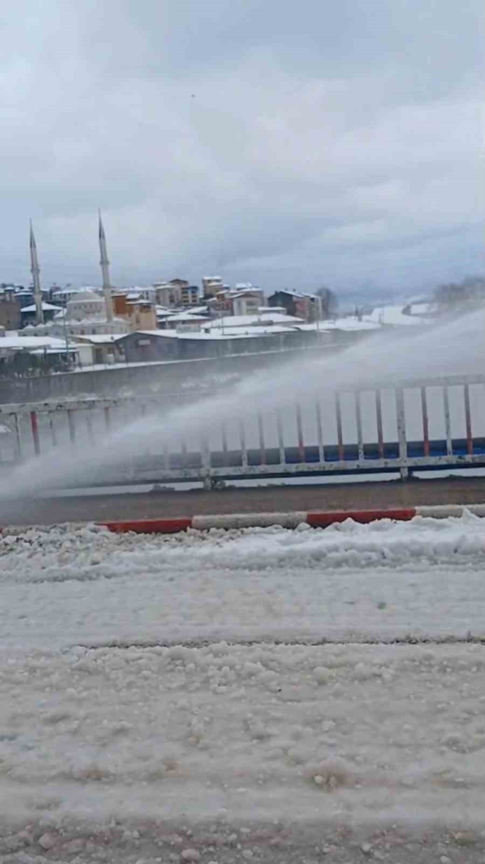 Alaplı Belediyesi ekipleri, buzlanmayla mücadele kapsamında tuz dökmek yerine denizden çekilen suyu itfaiye araçlarıyla cadde ve sokaklara püskürterek temizlik çalışması yaptı. Özellikle rampalı bölgelerde uygulanan yöntemle kar ve buzun kısa sürede eritildiği belirtildi.