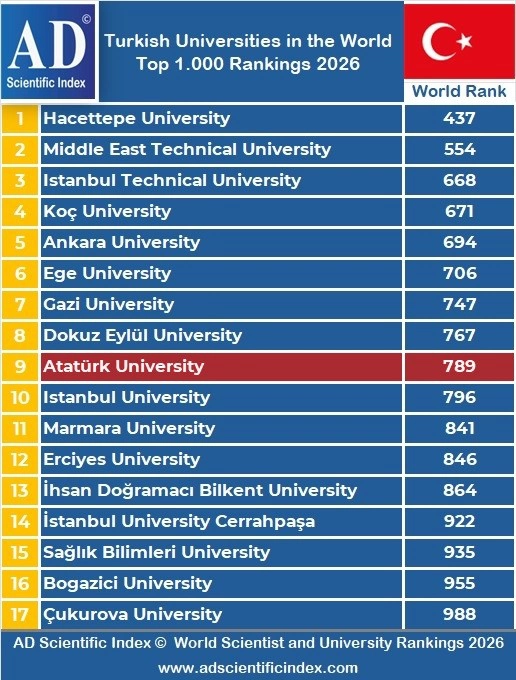 Yeni sonuçlara göre, Türkiye'den 17 üniversite ilk 1000'de yer alırken, Atatürk Üniversitesi 789. sırada yer almayı başardı. Atatürk Üniversitesi Rektörü Prof. Dr. Ahmet Hacımüftüoğlu, bu başarıyı değerlendirirken; bilimsel üretkenliğe, araştırma performansına ve uluslararası görünürlüğe dayalı bağımsız sıralamalarda üniversitelerinin her yıl daha yukarılara çıkmasının, köklü geçmişlerinin ve güçlü akademik kadrolarının bir sonucu olduğunu belirtti. Hacımüftüoğlu, bilime yön veren ve topluma değer katan çalışmalara imza atmaya devam ettiklerini vurgulayarak, bu başarının tüm akademik ve idari personelin, öğrencilerin ve araştırmacıların ortak emeği olduğunu ifade etti. Rektör, hedeflerinin bu ivmeyi daha da yukarı taşıyarak Atatürk Üniversitesini dünyada ilk 500 yükseköğretim kurumları arasına yerleştirmek olduğunu sözlerine ekledi.