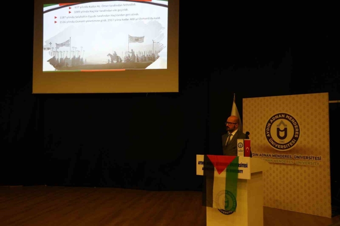 Törende bir sunum yapan ADÜ Siyasal Bilgiler Fakültesi Dekanı Prof. Dr. Muharrem Ekşi de, okullar ve hastanelerin hedef alınmasıyla insanların güvenli bölgeler aradığını ancak bu bölgelerin de bombalandığını belirtti. Prof. Dr. Ekşi, hayatını kaybedenlerin sivillerden oluştuğunu vurgulayarak, "Bugün maalesef 22 bin 227 çocuk, 22 bin 135 kadın, 20 bin 25 erkek olmak üzere toplamda 64 bin 387 kişi hayatını kaybetmiş durumda. Bunların hepsi sivil halk, askerden bahsetmiyoruz. Bu tür katliamları devletler durduramıyorsa devreye yumuşak güç olarak kamuoyu gücü giriyor. Sonuç vermesi zaman alsa da tarihe de bakıldığında yumuşak güç zaman zaman sert güce galebe çalabiliyor" dedi. Program sonunda ADÜ Rektörü Kent, Dekan Ekşi'ye teşekkür belgesi takdim etti ve ADÜ'de eğitim gören Filistinli öğrencilerle birlikte hatıra fotoğrafı çektirdi.