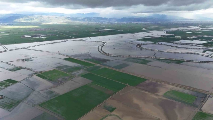 Aydın'ın Koçarlı ilçesinde meydana gelen taşkın, birçok araziyi sular altında bıraktı ve bu felaketin izleri dron ile havadan görüntülendi.