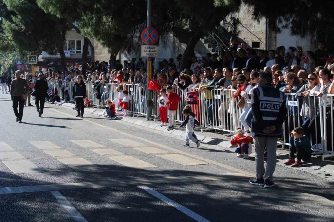 Tören, Aydın Valiliğinde gerçekleşen tebrikatın ardından İstasyon Meydanında başladı. Aydın Valisi Yakup Canbolat ve Aydın Büyükşehir Belediye Başkanı Özlem Çerçioğlu, tören aracıyla halkı ve katılımcıları selamladı. Saygı duruşu ve İstiklal Marşının okunmasıyla devam eden kutlamalar, günün anlam ve önemine dair konuşmalarla renklendi.
