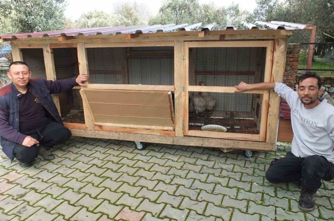 Balıkesir'in Burhaniye ilçesinde bakkallık yapan 45 yaşındaki Mustafa Zeybek, gezen tavuk yumurtasına olan ilgiyi fırsat bilerek evinin bahçesinde tekerlekli tavuk kümesleri tasarlamaya başladı.