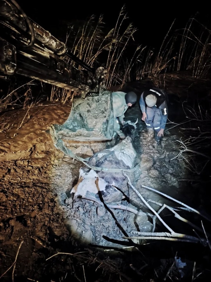 Bataklığa saplanan hayvan, ekiplerin titiz çalışmasıyla kurtarıldı