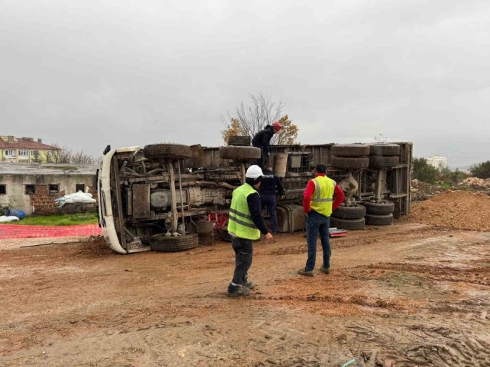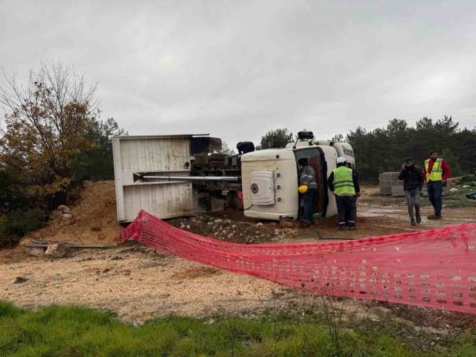 Bilecik'te, hafriyat yüklü bir kamyonun damperini boşaltırken devrilmesi sonucu araç içinde sıkışan sürücü yaralandı.
