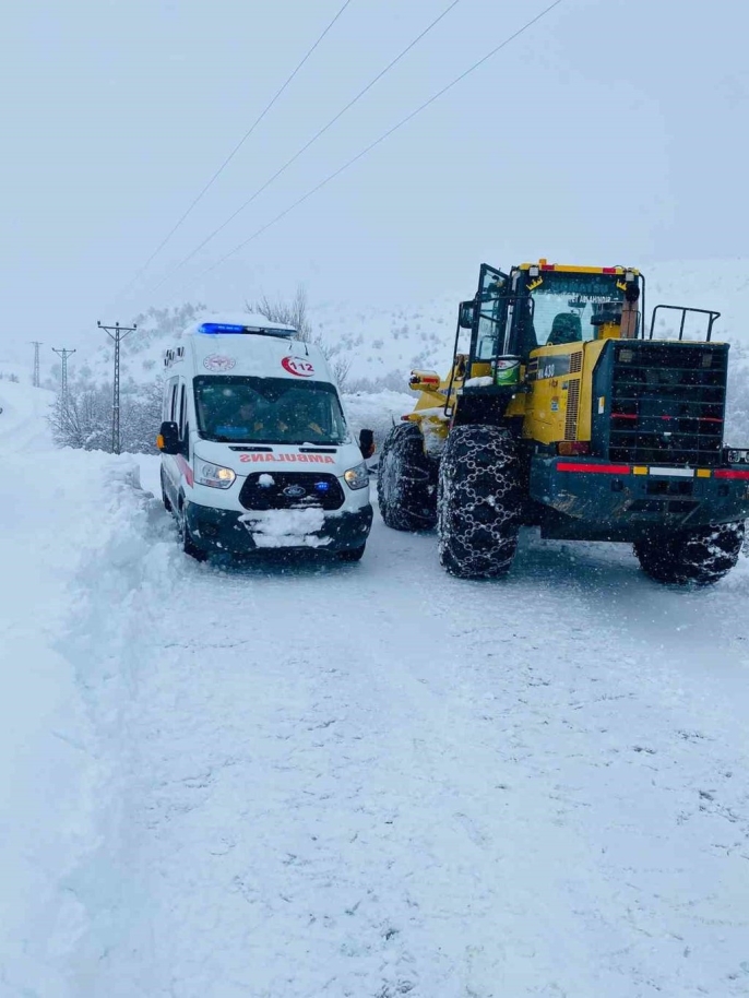 Yoğun kar yağışı nedeniyle ulaşımın imkansız hale geldiği bölgede, ekiplerin hızlı ve koordineli çalışması sayesinde kapanan köy yolu kısa sürede açılarak sağlık ekiplerinin bölgeye ulaşımı sağlandı.