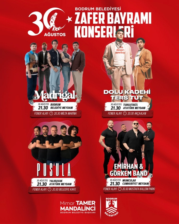 Saat 20.30'da başlayacak fener alayları, saat 21.30'da konserlerle devam edecek. Bodrum Belediye Başkanı Tamer Mandalinci, vatandaşları ellerinde Türk bayraklarıyla kutlamalara davet etti. Mandalinci, 30 Ağustos'un Türk milletinin bağımsızlık yolundaki inanç, cesaret ve azminin simgesi olduğunu vurguladı. Başkomutanlık Meydan Muharebesi'nin sadece askeri bir başarı değil, bir milletin yeniden dirilişi olduğunu belirten Mandalinci, bu zaferin vatan uğruna fedakarlık gösterenlerin eser olduğunu söyledi.