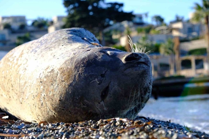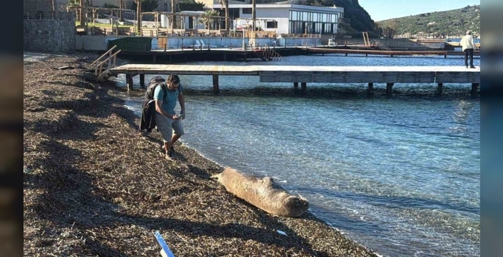 Muğla'nın Bodrum ilçesinde, Koyunbaba sahilinde kıyıya vuran bir Akdeniz foku, çevredeki vatandaşların dikkatini çekti.