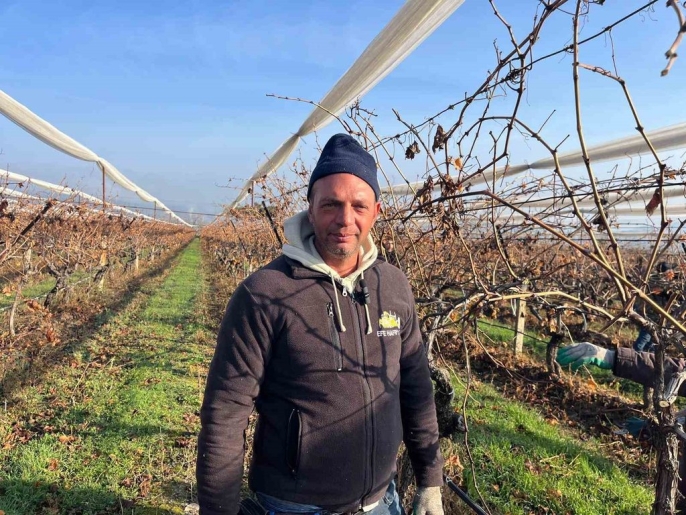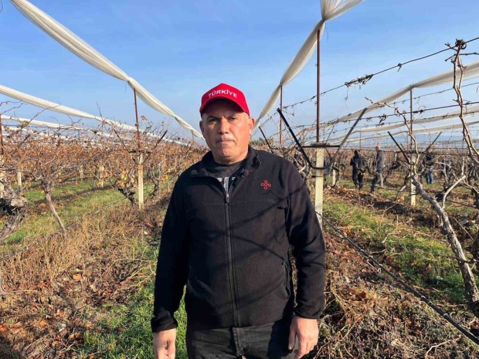 Buldan Bölmekaya mahallesinde üreticilik yapan Ramazan Uğuz, erkenci Süperior cinsi üzüm yetiştirdiğini ve şu anda budama mevsiminde olduklarını açıklıyor. Uğuz, toprak işlemesiz tarım yaparak yüzde elli su tasarrufu sağladıklarını, modern file tentelerle asmaları doludan ve sıcaktan koruduklarını vurguluyor. Bu uygulamayla maliyetleri düşürdüklerini ve diğer üreticilere de tavsiye ettiklerini ekliyor.