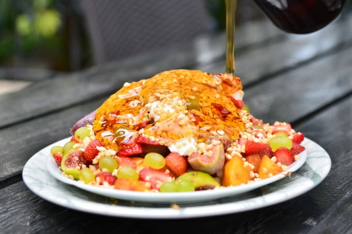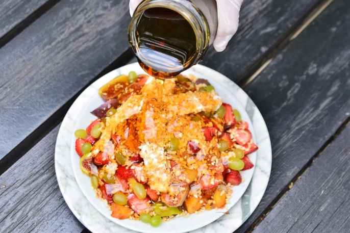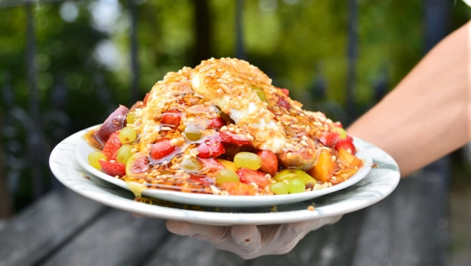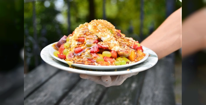 Bursa'da, Osmanlı saray mutfağından ilham alınarak hazırlanan 'ballı-kaymaklı meyve' tatlısı, 30 yıldır Bursa'nın damak tadına hitap ediyor. Bal, kaymak ve mevsim meyvelerinin bir araya geldiği bu tatlı, geleneksel lezzetleri yaşatmayı hedefleyen bir işletmenin elinden çıkıyor.