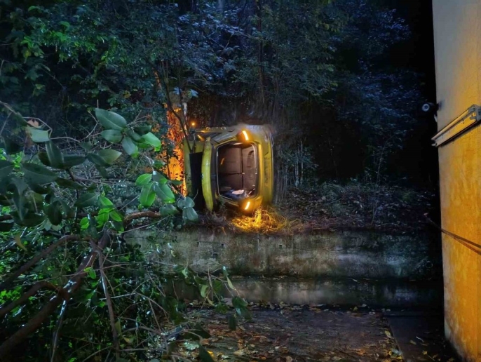 Bursa'nın Osmangazi ilçesi Kükürtlü Mahallesi'nde bulunan bir site otoparkında dramatik bir trafik kazası yaşandı. Sürücüsünün kontrolünü kaybettiği otomobil, otoparktan çıkış sırasında 10 metrelik yükseklikten komşu sitenin bahçesine uçtu.