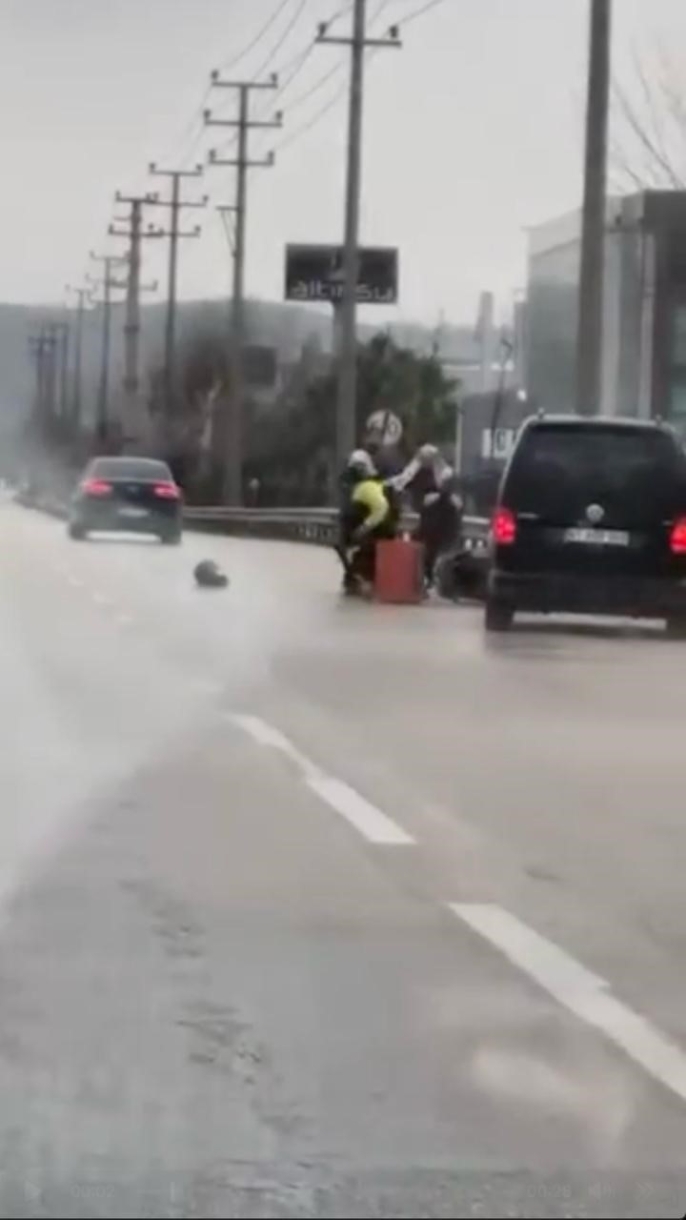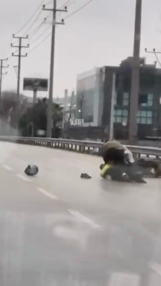 Bursa'nın Kestel ilçesinde, seyir halindeki bir sürücü ile motokurye arasında çıkan tartışma, şiddetli bir kavgaya dönüştü. Araçtan inen sürücü, kuryeye tekme ve yumruklarla saldırırken, olaya tanık olan kadınlar kavgayı ayırmak için büyük çaba gösterdi. Bir çocuk ise yaşananları şaşkınlıkla izlemek zorunda kaldı.