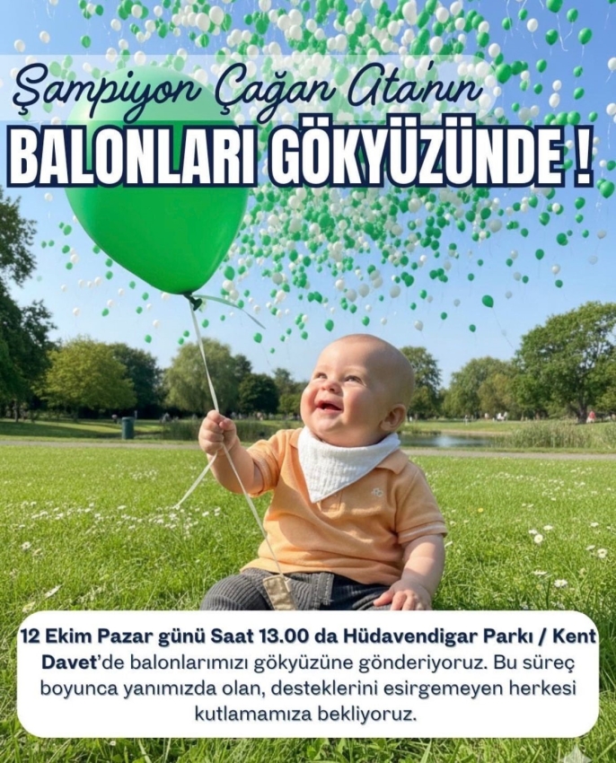 Bursa'da yaşayan Aleyna ve Ahmet Miraç Taran çiftinin 6 aylık bebekleri Çağan Ata'ya 18 günlükken SMA'nın en ağır türü olan Tip-1 teşhisi konuldu. Valilik onayıyla başlatılan yardım kampanyasında mutlu sona ulaşılmasının ardından, Bursaspor eski yöneticisi Hakan Dinçtürk'ün koordinasyonunda özel bir etkinlik düzenlenecek. Pazar akşamı saat 19.00'da oynanacak Bursaspor-Menemen FK maçı öncesinde, Çağan Ata için stadyumda 20 bin balon gökyüzüyle buluşacak.