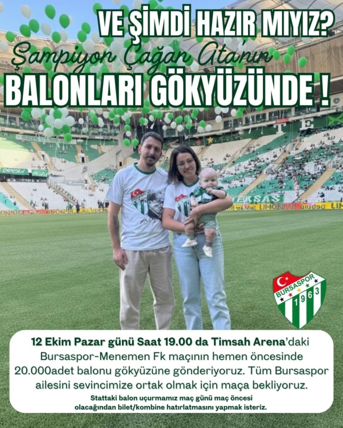 Bursaspor taraftarı, SMA hastası minik Çağan Ata'nın tedavi kampanyasında mutlu sona ulaşmasını kutlamak amacıyla Atatürk Spor Kompleksi Matlı Stadyumu'nda 20 bin balonu gökyüzüne salacak. Organizasyona katılım sağlamak isteyen sporseverlerden, yanlarında yeşil veya beyaz balon getirmeleri talep edildi.
