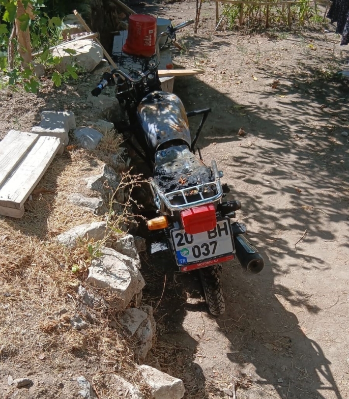 Denizli'nin Çameli ilçesinde bir evin bahçesinde park halindeki motosiklet, kimliği belirsiz kişi veya kişiler tarafından kundaklandı.