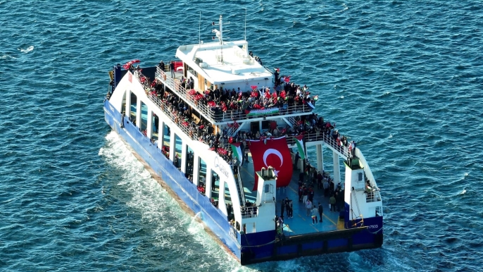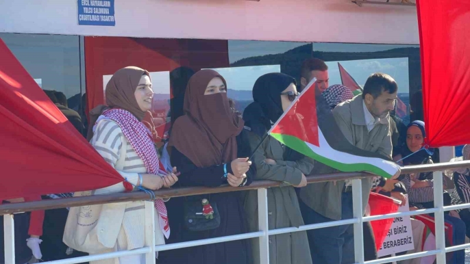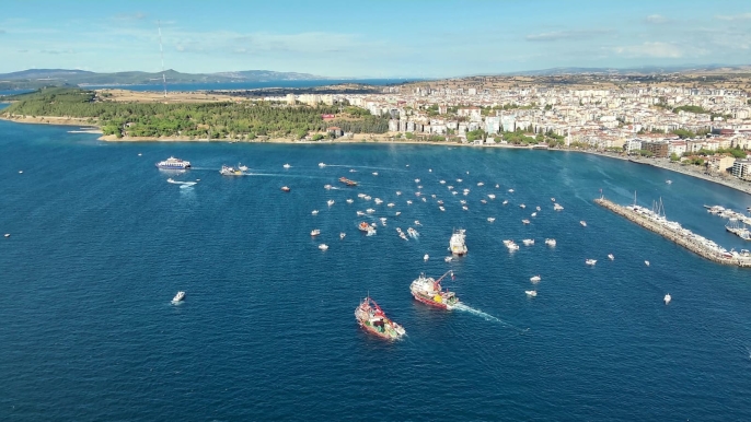Çanakkale Boğazı'nda Türk ve Filistin bayraklarıyla donatılan tekneler, Gazze'ye insani yardım ulaştırmak amacıyla yola çıkan ve İsrail'in saldırısına uğrayan Küresel Sumud Filosu'na destek vermek amacıyla bir deniz turu gerçekleştirdi.