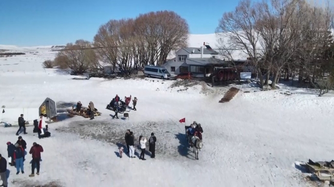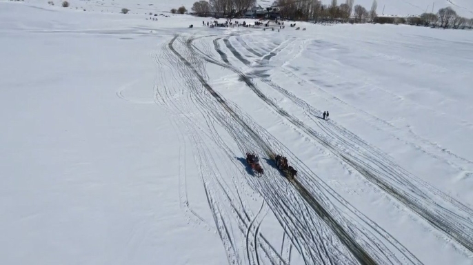 Kars'ın Arpaçay ilçesi sınırlarında yer alan ve kışın tamamen donarak devasa bir pist haline gelen Çıldır Gölü, Ramazan Bayramı süresince de yerli ve yabancı turistlerin yoğun ilgisini görüyor. Gökyüzünün maviliği ile buz tabakasının birleştiği bu eşsiz noktada, misafirler yüzeyi buzla kaplı göl üzerinde yürümenin ve atlı kızaklarla hız yapmanın heyecanını doyasıya yaşıyor. Kızakçı Dural Daşdemir, Ramazan Bayramı'na kadar atlı kızak etkinliklerinin süreceğini belirterek, "Çok güzel bir ortam var. Buz kalınlığı çok güçlü, şu an 70 santimin üzerinde buz kalınlığı var. Bayrama kadar biz Çıldır Gölü üzerinde aktivitelerimizi devam edeceğiz. Talep de var, Ramazan boyu açığız. Bayramda da güzel bir etkinlik planlıyoruz. Bayramda da Çıldır Gölü üzerinde atlı kızaklarla tüm etkinliklerimize devam edeceğiz" dedi. İstanbul'dan eşiyle birlikte gelen Fatma Tunçsiper ise, "İstanbul’dan geldik, Çıldır Gölü’nü, bu doğa harikasını görmeye, gerçekten çok güzeldi. O kadar büyük bir gölün üzerinde gezmekten keyf aldık" ifadelerini kullandı. Eşi Volkan Tunçsiper de, "Doğa harikasını görüp, burada deneyimledik. Gerçekten güzel bir deneyimdi. Her şey çok güzeldi, herkese tavsiye ederiz" şeklinde konuştu.