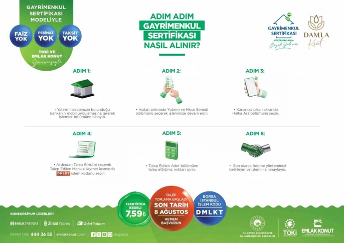 Yatırım hesabı olan herkes, hisse senedi alır gibi Gayrimenkul Sertifikası alabilir. Halk Yatırım, Ziraat Yatırım, Vakıf Yatırım gibi banka veya aracı kurumlardan yatırım hesabı açtıktan sonra, Borsa İstanbul üzerinden 'DMLKT' işlem koduyla talepte bulunulabilir. Bir sertifikanın pay adet fiyatı 7,59 TL olup, alımında alt ve üst limit bulunmuyor. Sertifikalar 14 Ağustos 2025'ten itibaren Borsa İstanbul'da işlem görecek. Üç farklı kazanç yöntemi sunuluyor: konut edinme hakkı, nakit kazanma hakkı ve alım-satım yoluyla kâr etme imkanı.