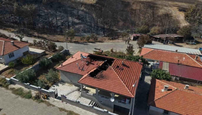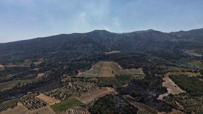 Soğutma çalışması yapılan alanlar ve Bölmekaya Mahallesi'ndeki yangından zarar gören araziler, dron ile havadan görüntülendi. Hasar tespiti ve değerlendirme çalışmaları devam ediyor.