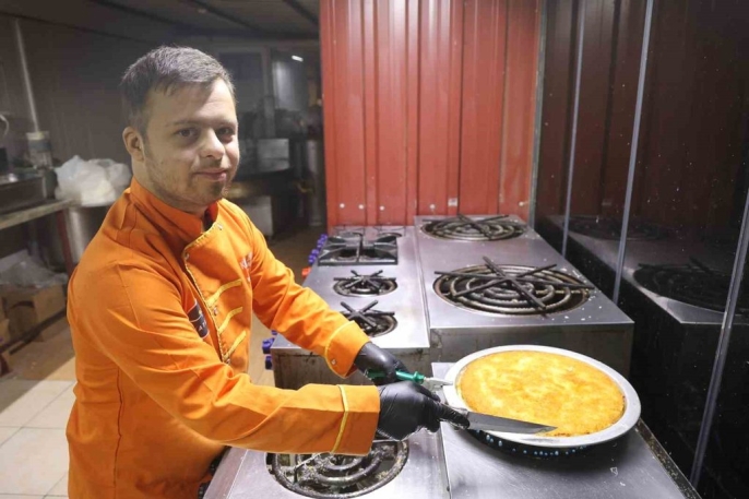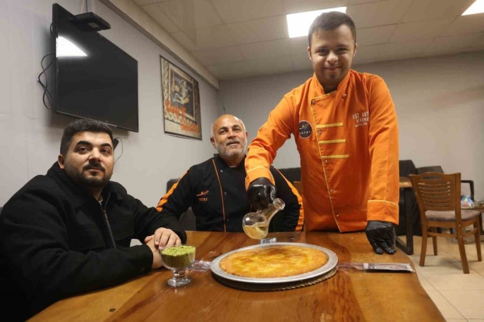 Hatay'da yaşayan 21 yaşındaki down sendromlu Mehmet Doğru, 6 ay önce çırak olarak başladığı künefecide ustası Müslüm Günal'ın rehberliğinde dünyanın en iyi tatlısı olan Antakya künefesini yapmayı öğrendi.