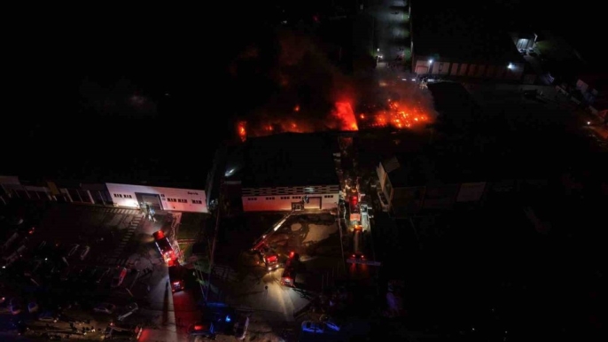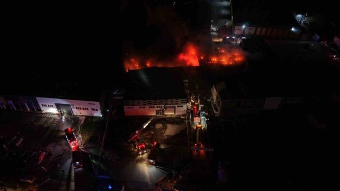 Düzce'de bulunan strafor fabrikasında meydana gelen yangın, dronla havadan görüntülendi. Yangının çıkış nedeni henüz belirlenemezken, rüzgarın etkisiyle alevlerle mücadele devam ediyor.