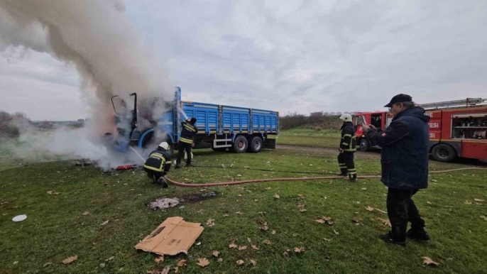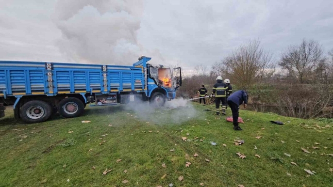Sürücü Oktay Soyar, kamyonunu dinlenmek için uygun bir alana park ettiğini ve kahve içmek istediği sırada aracın ön kısmından dumanlar yükselmeye başladığını belirtti. Kısa sürede alevlerin yükseldiğini ifade eden Soyar, yangına yangın tüpüyle müdahale ettiğini ancak başarılı olamadığını söyledi.