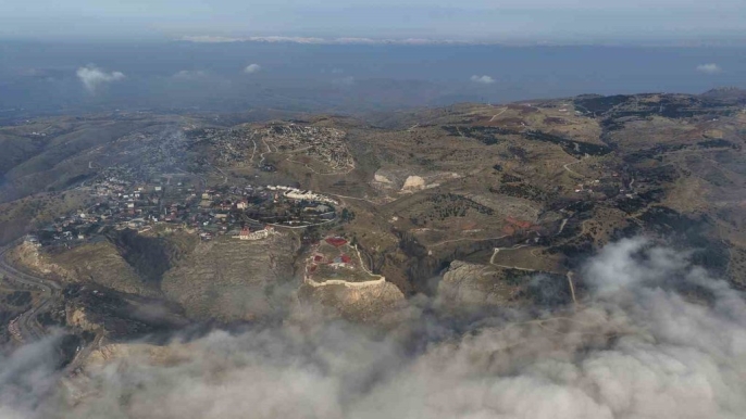 Tarihi Harput Mahallesi'nden çekilen drone görüntülerinde, Elazığ'ın kuşbakışı görünümünde sisin yer yer dağıldığı ve şehrin siluetinin ortaya çıktığı görüldü. Bu noktada, sis perdesinin aralanmasıyla birlikte tarihi dokunun zarafeti belirginleşti. Ancak, kent merkezinin büyük bölümü hâlâ yoğun sis altında kalmaya devam etti.