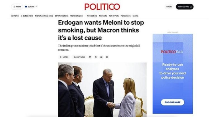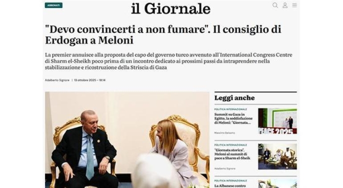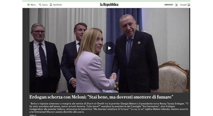 Corriere Della Sera gazetesi, "Erdoğan, Meloni'ye takıldı" başlığıyla yayımladığı haberinde, Erdoğan ve Meloni arasındaki samimi anı ve Cumhurbaşkanı Erdoğan'ın gülümseyerek "sigarayı bırakması gerektiğini" söylediğini aktardı. Habere göre, bu espri hem Meloni'yi hem de Fransa Cumhurbaşkanı Macron'u güldürdü. La Repubblica gazetesi de Şarm Eş Şeyh'teki diyalog görüntülerine yer vererek, Erdoğan'ın Meloni'ye "Sizi iyi gördüm ama sigarayı bıraktırmam lazım" dediğini belirtti. Bu keyifli anı, Fransa Cumhurbaşkanı Macron'un da ilgiyle takip ettiği vurgulandı.