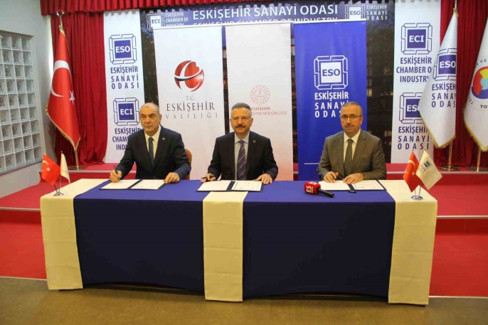 Vali Hüseyin Aksoy, İl Milli Eğitim Müdürü Sinan Aydın ve ESO Başkanı Celalettin Kesikbaş, protokolü imzaladı. 'Her Fabrika Bir Okul' sloganıyla yürütülen proje, eğitim ve üretimi, gençliği ve sanayiyi bir araya getiriyor.