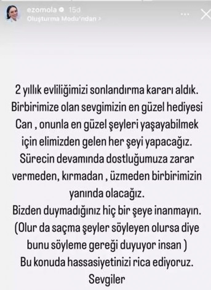 Geçtiğimiz aylarda bakıcılığa karşı görüşlerini dile getiren ve bebeğinin kendisi tarafından bakılmasını tercih ettiğini belirten Mola, sosyal medya hesabından yaptığı açıklamada, 2 yıllık evliliklerini sonlandırdıklarını doğruladı. Mola, 'Birbirimize olan sevgimizin en güzel hediyesi Can, onunla en güzel şeyleri yaşayabilmek için elimizden gelen her şeyi yapacağız. Sürecin devamında dostluğumuz zarar vermeden, kırmadan, üzmeden birbirimizin yanında olacağız. Bizden duymadığınız hiçbir şeye inanmayın. Bu konuda hassasiyetinizi rica ediyoruz.' ifadelerini kullandı.