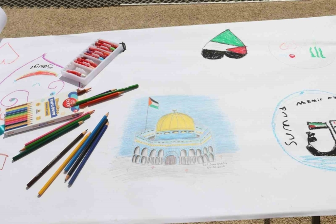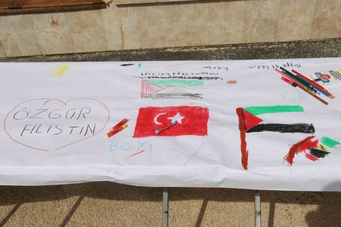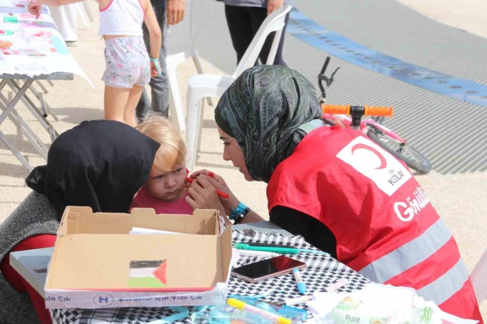 Yetim Vakfı Muğla Temsilciliği tarafından Şehit Fethi Bey Parkı'nda organize edilen programa, farklı sivil toplum kuruluşlarının temsilcileri, öğrenciler ve aileler iştirak etti. Etkinlik kapsamında çocuklar, yere serilen tuvaller üzerine resimler yaparak Gazze'ye yönelik desteklerini ifade ettiler. Yapılan çizimlerde Mescid-i Aksa, Türk ve Filistin bayrakları ile boykot edilmesi çağrısı yapılan ürünler öne çıktı. Çocukların yüzlerine Türk ve Filistin bayrakları çizildi, ayrıca pamuk şeker ikramı yapıldı.