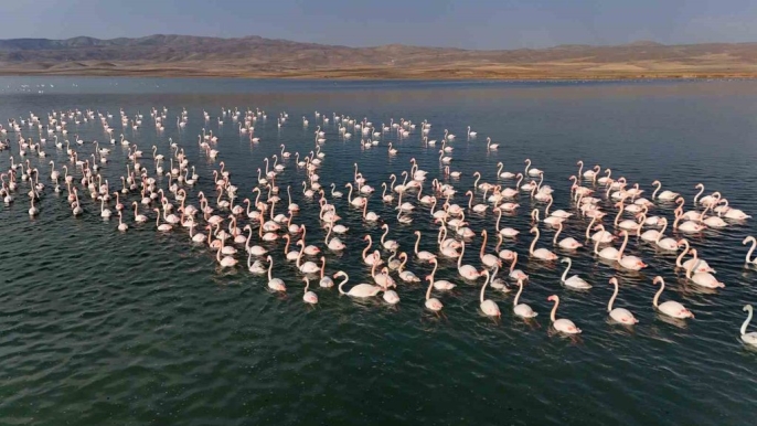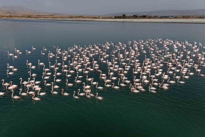 Doğunun saklı cenneti Van'daki Erçek Gölü, zarif misafirleri flamingolara ev sahipliği yapmaya devam ediyor. Göçmen kuşların Kuzey Afrika'dan İran'a uzanan yolculuğunda en önemli konaklama merkezlerinden biri olan Van Gölü havzası, sulak alanlarıyla binlerce kuş türünü barındırıyor. Bu yıl da flamingolar, hava sıcaklığının mevsim normallerinin üzerinde seyretmesi nedeniyle konaklama sürelerini uzattı.