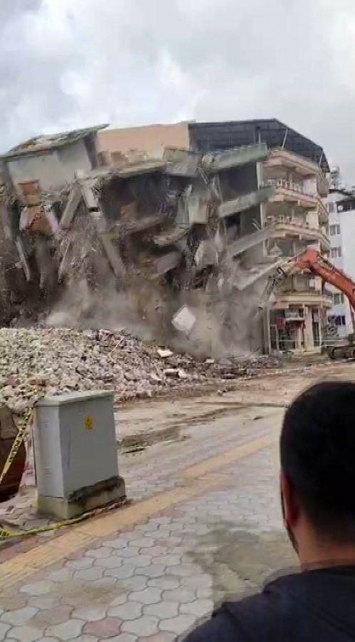 Hatay'da ağır hasarlı bina iş makinesiyle yıkıldı