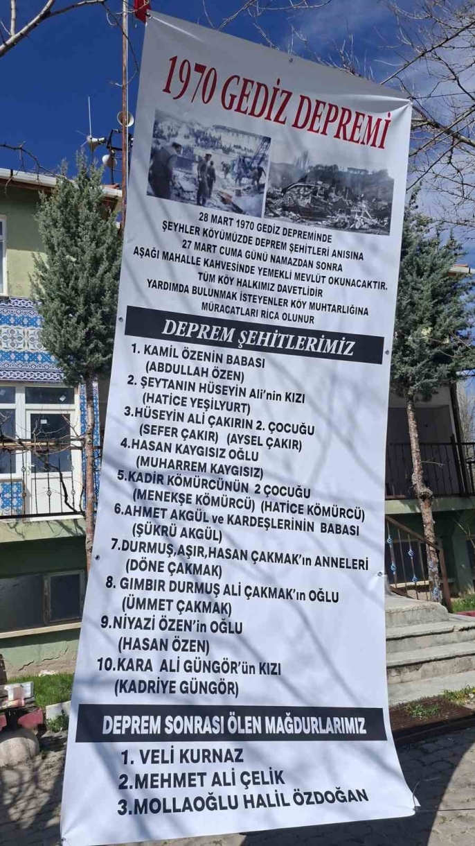 Kütahya'nın Hisarcık ilçesine bağlı Şeyhler köyünde, 1970 Gediz Depremi'nde hayatını kaybedenler için anlamlı bir anma programı düzenlendi. Depremin 56. yıl dönümü vesilesiyle, köy camisinde mevlit okutuldu ve ardından köy meydanında hayır yemeği ikram edildi.