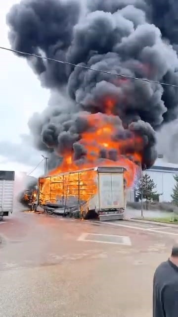 Saat 12.30 sularında 16 BRT 373 plakalı çekiciye bağlı 16 BPA 863 plakalı dorsede bulunan süngerler alev aldı. Kısa sürede büyüyen yangın, hemen yanında park halinde duran mobilya yüklü 16 BDD 870 plakalı dorsenin de tutuşmasına neden oldu. Yangın sırasında elektrik tellerinin zarar görmesi ve zaman zaman yaşanan patlamalar paniğe yol açtı.