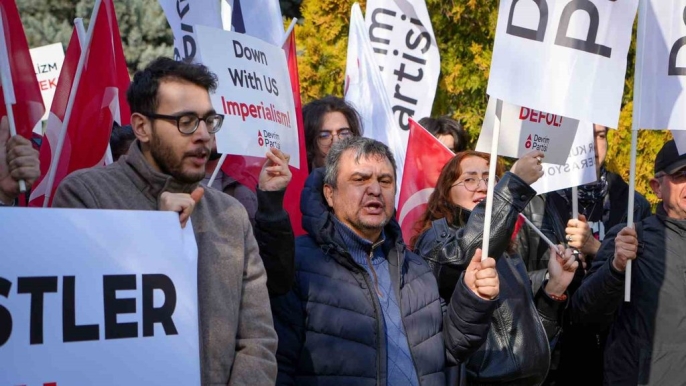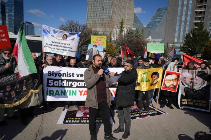 ABD'nin Ankara Büyükelçiliği önünde, kalabalık bir grup toplanarak protesto gösterisi düzenledi. İran bayrakları ve Hamaney'in fotoğraflarının taşındığı gösteride,