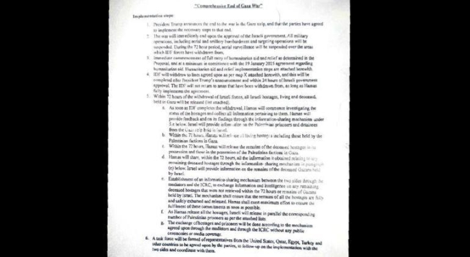 ABD Başkanı Donald Trump, İsrail ile Hamas'ın Gazze'de ateşkes planının ilk aşamasını onayladığını duyurdu. Bu anlaşma ile tüm rehinelerin serbest bırakılacağı ve İsrail'in önceden belirlenen hatta geri çekileceği belirtildi. Trump, ateşkes sürecine katkı sağlayan Katar, Mısır ve Türkiye'ye teşekkürlerini iletti. Rehinelerin muhtemelen 13 Ekim'de serbest bırakılacağını açıklayan Trump, Gazze'nin yeniden imarı ve bölgede barışın sağlanması için bir 'Barış Konseyi' oluşturulacağını ifade etti. İsrail Başbakanı Binyamin Netanyahu, anlaşmanın İsrail Devleti için diplomatik bir başarı ve ulusal bir zafer olduğunu belirtti. İsrail ordusu, Gazze Şeridi'ndeki bazı noktalardan askerlerini kısmen çekmeye hazırlandığını duyurdu. Hamas da ateşkes anlaşması çerçevesinde serbest bırakılması planlanan Filistinlilerin listesini ilettiğini ve arabulucu ülkelere teşekkür ederek anlaşmanın uygulanması konusunda garantiler talep etti.