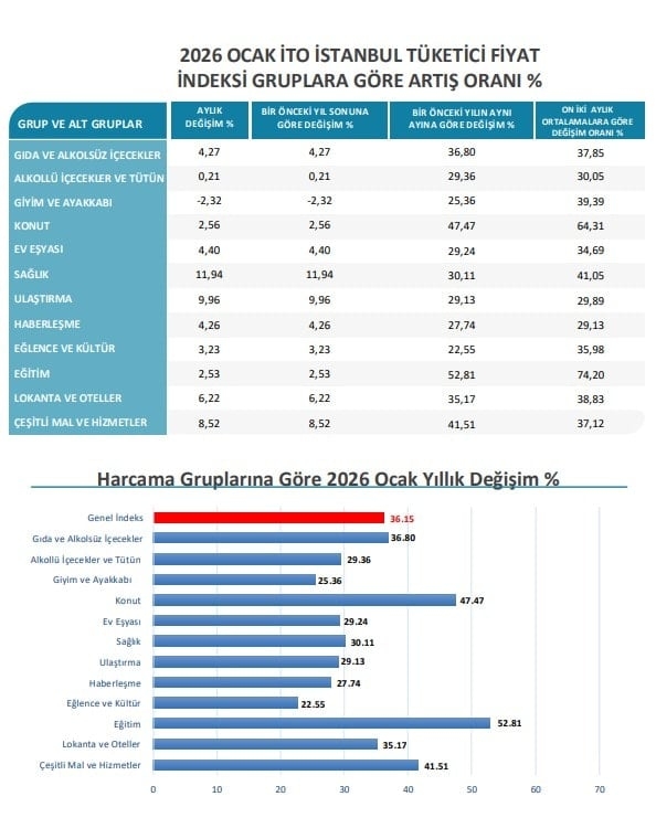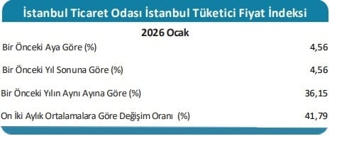 İstanbul Ticaret Odası'nın (İTO) açıkladığı verilere göre, 2026 yılının ocak ayında İstanbul'da enflasyon rakamları belirgin bir artış gösterdi. Aylık bazda yüzde 4,56'lık bir yükseliş kaydedilirken, yıllık enflasyon oranı ise yüzde 36,15'e ulaştı.
