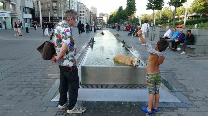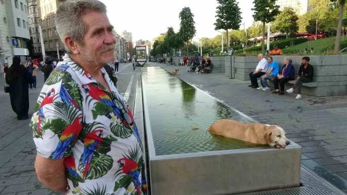 Taksim Meydanı'nda güneşin yakıcı etkisiyle mücadele eden vatandaşlar, şemsiye ve yelpaze kullandı. Sıcaktan bunalan küçük bir çocuk, Taksim Meydanı'ndaki süs havuzuna girerek serinlemeye çalıştı. Çocuğun ardından bir köpek de havuza girdi.