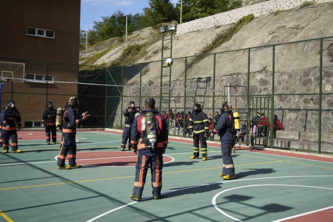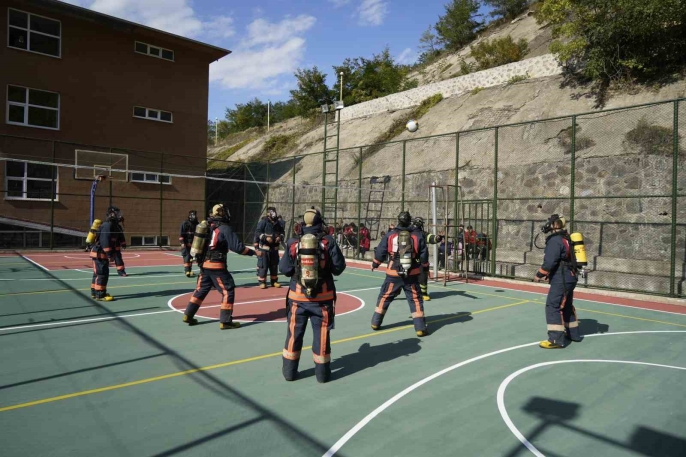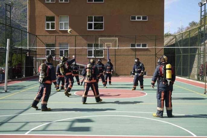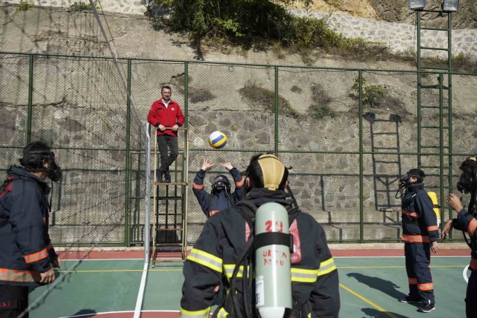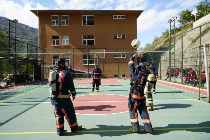 Oksijen tüpleri ve ısıya dayanıklı elbiselerle voleybol maçı yapan öğrenciler, hava tasarrufu becerilerini geliştiriyor. Bu yöntem, gerçek acil durumları taklit ederek onların saha performansını güçlendiriyor.