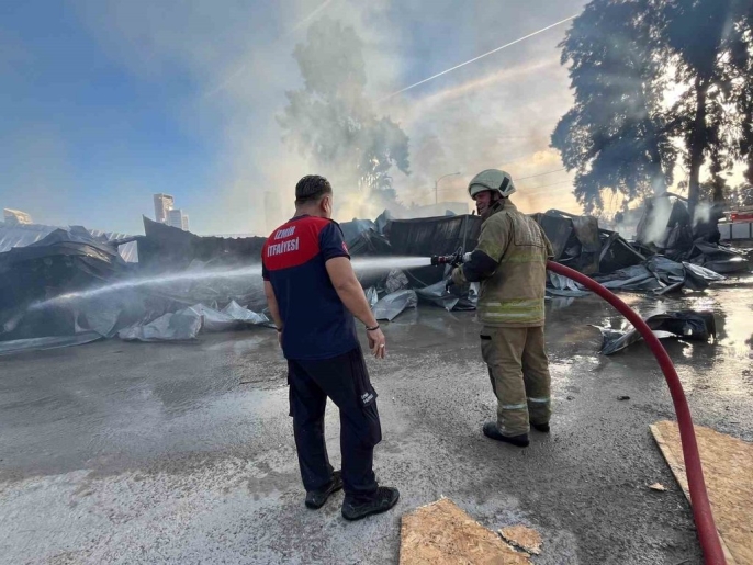 Bayraklı Adalet Mahallesi'nde saat 15.30 sularında meydana gelen olayda, henüz belirlenemeyen bir nedenle işçi konteynerlerinden birinde başlayan yangın hızla yayıldı. İhbar üzerine bölgeye sevk edilen çok sayıda itfaiye ekibi, alevleri kontrol altına almak ve söndürmek için yoğun bir mücadele verdi. Soğutma çalışmaları devam ederken, ilk belirlemelere göre 5 konteyner ve 2 aracın tamamen yandığı ve kullanılamaz duruma geldiği tespit edildi.