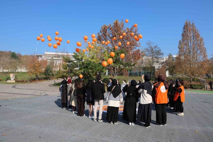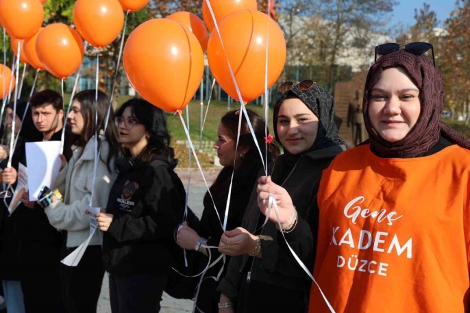 Düzce Üniversitesi 15 Temmuz Demokrasi Meydanı'nda bir araya gelen öğrenciler, kadına yönelik şiddete dikkat çekmek ve bu konuda toplumsal bilinç oluşturmak amacıyla turuncu renkli balonları gökyüzüne bıraktı. Bu sembolik eylemle, şiddetin her türüne karşı ortak bir duruş sergilendi.