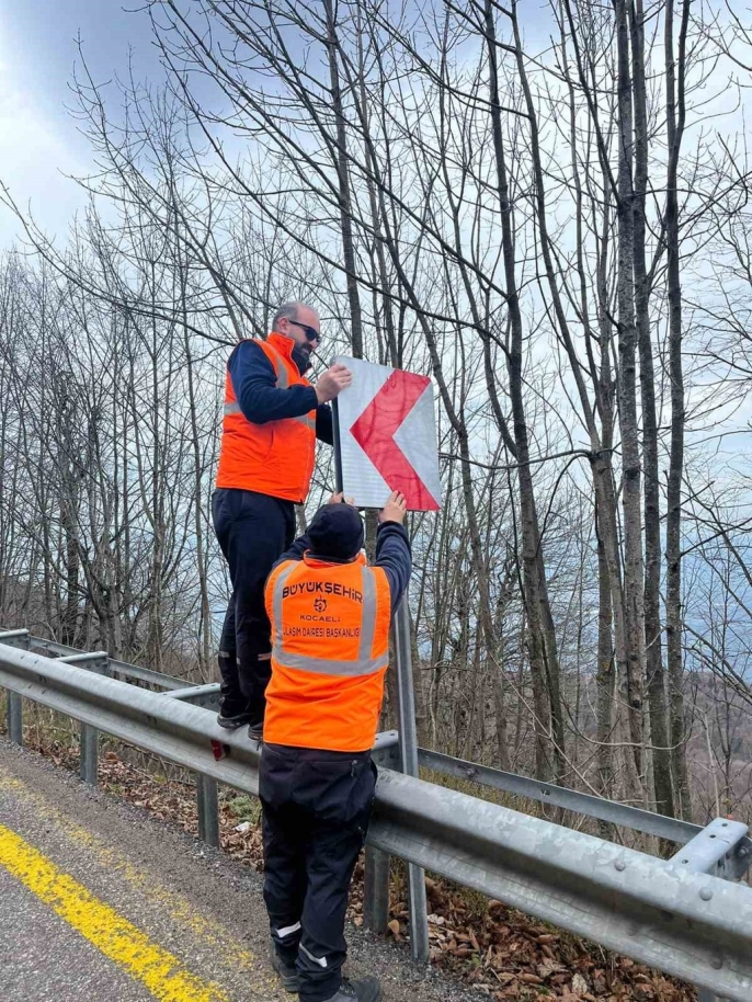 Kocaeli Büyükşehir Belediyesi, yoğun kar yağışı ve sisin etkili olabildiği bölgede ulaşımın güvenliğini sağlamak amacıyla Ulaşım Dairesi Başkanlığı ekiplerini harekete geçirdi. Ekipler tarafından yapılan taramalarda, hasar görmüş veya görünürlüğü azalmış trafik materyalleri tespit edildi. Bu doğrultuda, sürücülerin rotayı güvenli bir şekilde takip edebilmeleri için yol kenarlarına 24 adet kar direği, 11 adet levha direği ve 12 adet trafik levhası monte edildi. Ayrıca, eğilmiş durumdaki 9 direk de onarıldı.