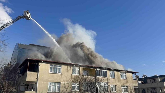 Dün yaşanan doğal afetin ardından, çatıdaki hasarın onarılması için çalışmalar başlatıldı. Ancak bu sırada, çatı yalıtımında kullanılan membran malzeme alev aldı. Kısa sürede büyüyen alevler çatıyı tamamen sardı.