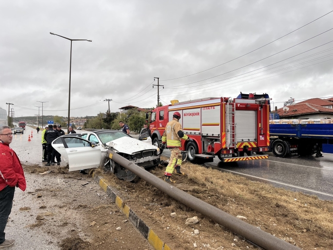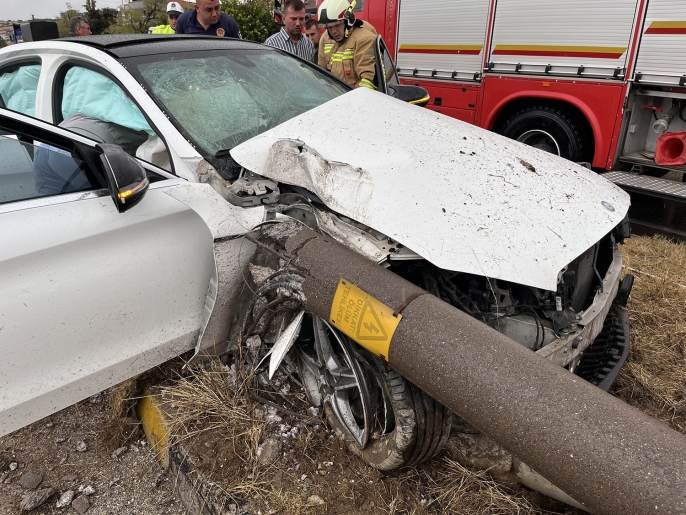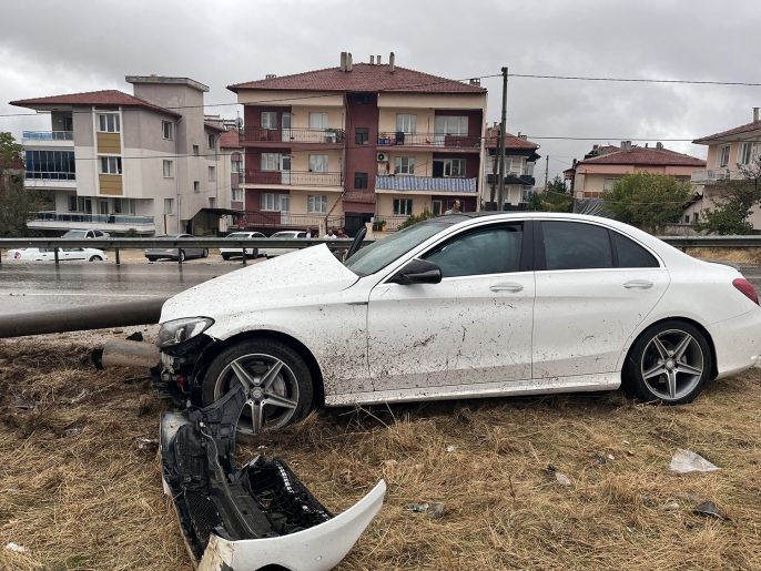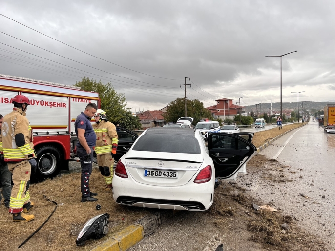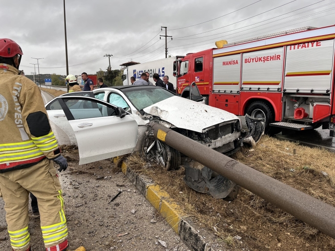 Manisa'nın Kula ilçesinde, İzmir-Ankara D300 Karayolu üzerinde meydana gelen trafik kazasında bir otomobil, yağış nedeniyle kayganlaşan yolda kontrolden çıkarak orta refüje çıktı ve aydınlatma direğine çarptı.