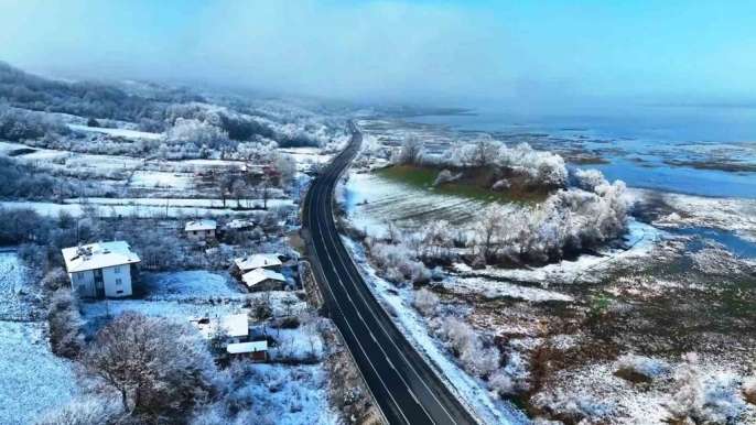 Ladik Gölü, kar yağışıyla beyaz gelinliğini giydi