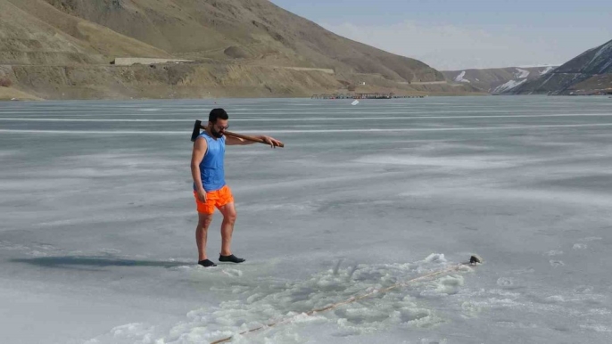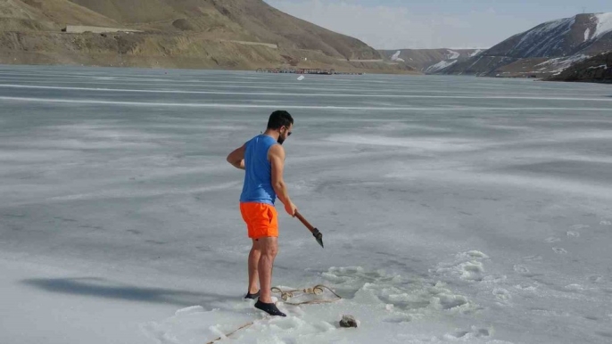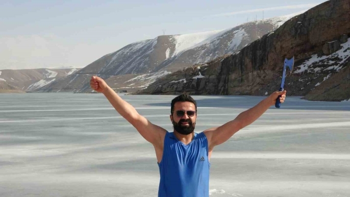 Doğu Anadolu’nun sert kış koşullarında dikkat çeken bir manzara sergileyen Türken, suya girmeden önce barajın bendindeki kaya parçalarına kalın ip bağlayarak güvenliğini sağladı. Baltayla buzu kırdıktan sonra suya girip yanında getirdiği termosla çay içti. Bu sırada meyve de yiyerek hem sağlıklı yaşama vurgu yaptı hem de kış turizmi için ilginç bir etkinlik gerçekleştirdi.
