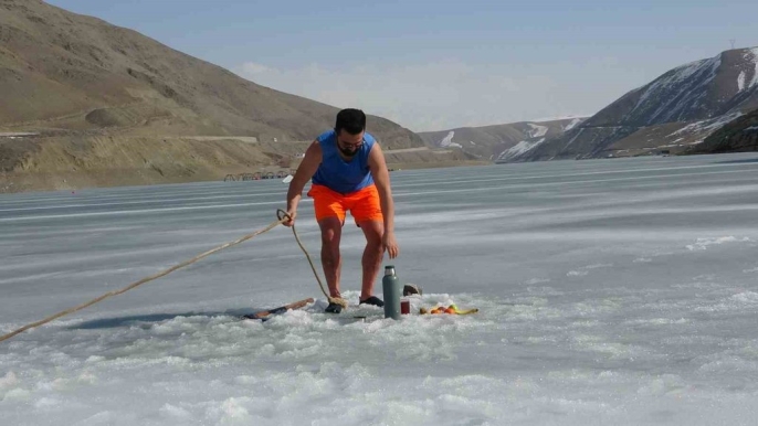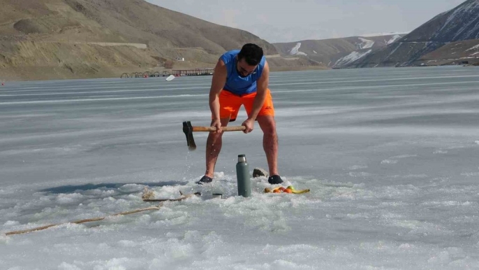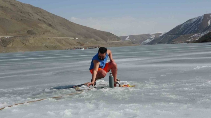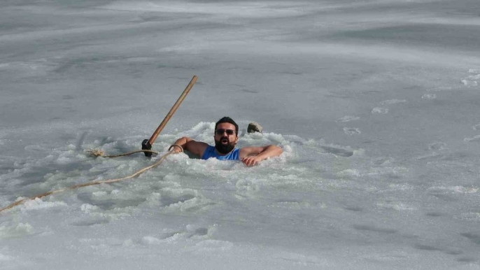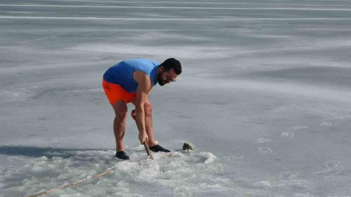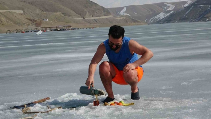 Van’da dikkat çekici etkinlikleriyle tanınan maceracı öğretmen Muhammed Türken, Zernek Barajı'ndaki buz tutmuş suyun yüzeyini kırarak suya girdi. Balık avlamak yerine buzu kırıp soğuk suda çay içen Türken, sağlıklı yaşamın önemine ve kış turizmine farklı bir bakış açısı sundu.