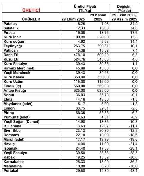 Türkiye Ziraat Odaları Birliği (TZOB), yaklaşık 20 yıldır sürdürdüğü aylık fiyat takip çalışmasının Kasım ayı sonuçlarını açıkladı. Buna göre, marketlerde izlenen 42 ürünün 24'ünde fiyat düşüşü yaşandı. TZOB, verilerin sahada ve belgeli olarak tespit edildiğini, tüm bölgelerden alınan fiyatların ortalamasına dayandığını ve gerçek tabloyu yansıttığını vurguladı.
